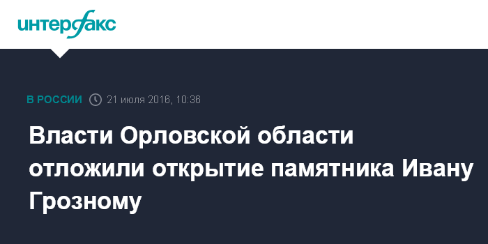 Москва. 21 июля. INTERFAX.RU - Установка в Орле памятника царю Ивану Грозному, запланированная на 3 августа, отложена, сообщает пресс-служба областного правительства.
