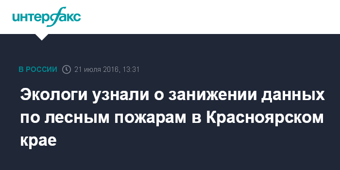 Москва. 21 июля. INTERFAX.RU - Площадь действующих лесных пожаров в Красноярском крае по состоянию на 20 июля перевалила за 1 млн га, что в тысячу раз больше официальной статистики, заявили в Гринпис России.