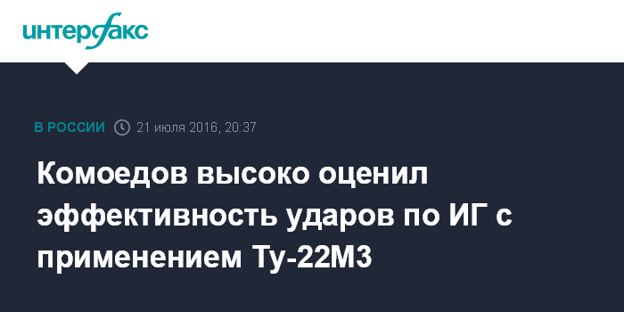 Москва. 21 июля. INTERFAX.RU - Применение Россией дальних бомбардировщиков Ту-22М3 против объектов террористической группировки "Исламское государство" (запрещена в РФ) в Сирии эффективно, заявил "Интерфаксу" в четверг глава думского комитета по обороне, экс-командующий Черноморским флотом РФ адмирал Владимир Комоедов.