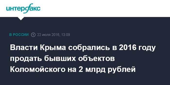 Москва. 22 июля. INTERFAX.RU - Власти Крыма рассчитывают выручить до конца года не менее 2 млрд рублей от продажи порядка 20 объектов, ранее принадлежащих украинскому олигарху Игорю Коломойскому, сообщил первый вице-спикер регионального парламента Константин Бахарев.