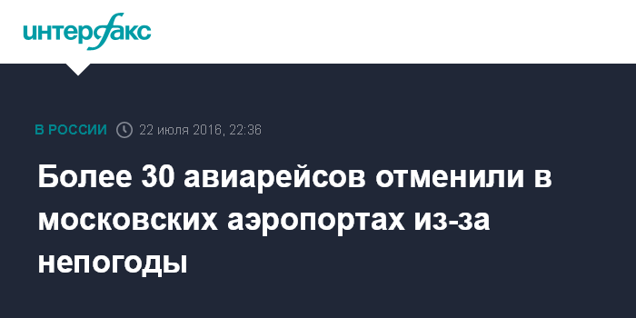 Москва. 22 июля. INTERFAX.RU - В московских аэропортах отменено более 30 рейсов, около 40 еще задерживаются.