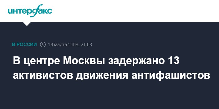 Москва. 19 марта. ИНТЕРФАКС-МОСКВА - В Москве в районе Пушкинской площади задержано 13 человек из молодежного движения антифашистов, сообщил в среду "Интерфаксу" источник в правоохранительных органах.