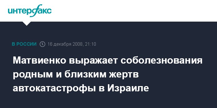 Москва. 16 декабря. INTERFAX.RU - Губернатор Петербурга Валентина Матвиенко выражает соболезнования родным и близким жертв автокатастрофы близ израильского Эйлата.