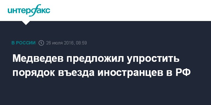 Москва. 26 июля. INTERFAX.RU - Премьер РФ Дмитрий Медведев внес в Госдуму законопроект о совершенствовании правового регулирования порядка выезда из России и въезда в Россию иностранных граждан.