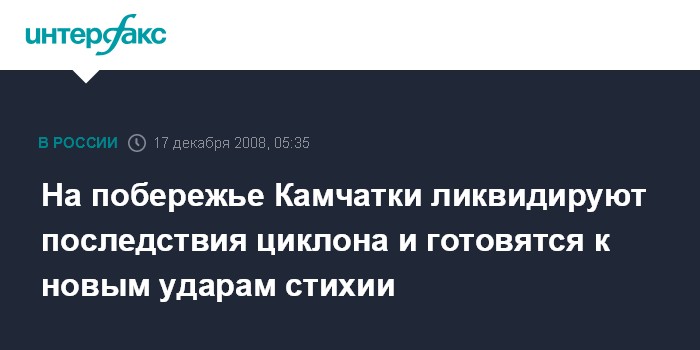 Об этом агентству "Интерфакс" сообщил в среду заместитель председателя правительства Камчатского края Сергей Пахомов, возглавляющий оперативный штаб, созданный для ликвидации последствий циклона, который обрушился накануне на восточное побережье Корякского округа.