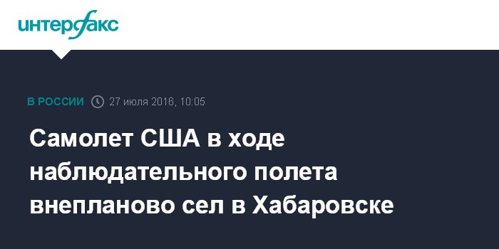 Как сообщил агентству информированный источник, совершивший внеплановую посадку в Хабаровске самолет выполнял рейс в рамках реализации международного Договора по открытому небу.