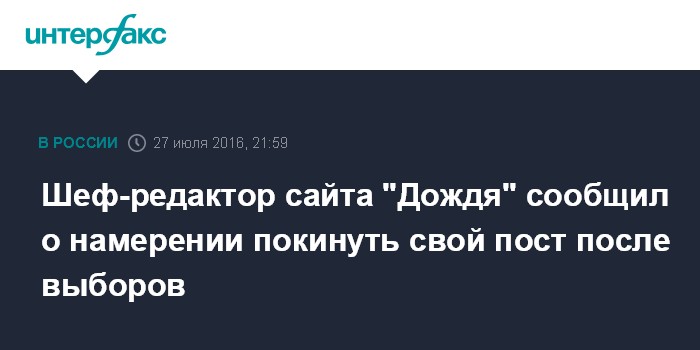 "Друзья, после думских выборов в сентябре я перестану быть шеф-редактором сайта "Дождя". Это мое спокойное и выверенное решение, к которому я шел последние полгода", - написал он в Facebook.