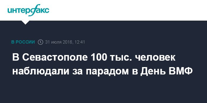 Москва. 31 июля. INTERFAX.RU - 100 тысяч человек посмотрели парад и военно-спортивный праздник в День Военно-морского флота России в воскресенье в Севастополе, сообщил представитель правительства города.