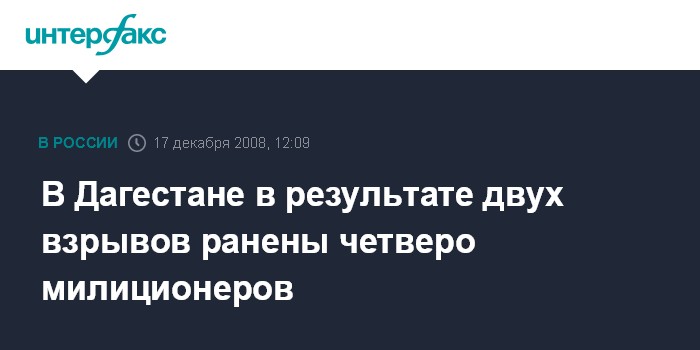 Москва. 17 декабря. INTERFAX.RU - Четверо сотрудников милиции получили ранения в результате двух взрывов в Хасавюртовском районе Дагестана, сообщили "Интерфаксу " в среду в пресс-службе МВД республики.