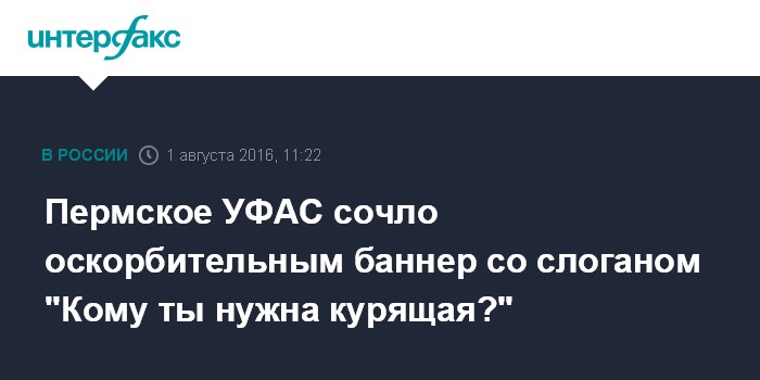 Москва. 1 августа. INTERFAX.RU - Управление ФАС по Пермскому краю возбудило дело по признакам нарушения закона "О рекламе" в отношении распространителя социальной рекламы со слоганом "Кому ты нужна курящая?", сообщается на сайте ведомства в понедельник.