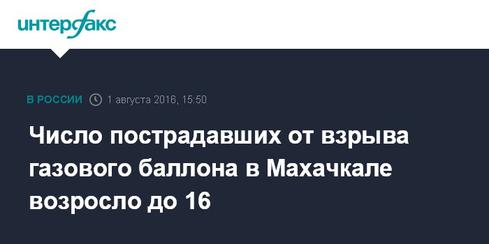 Москва. 1 августа. INTERFAX.RU - Число пострадавших в результате взрыва газовоздушной смеси в Махачкале увеличилось до 16 человек, сообщил "Интерфаксу" источник в экстренных службах.