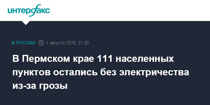 Москва. 1 августа. INTERFAX.RU - Электроэнергия отключилась в понедельник вечером более чем в сотне населенных пунктов двух районов Пермского края из-за погодных условий, сообщает ГУ МЧС по региону в понедельник.