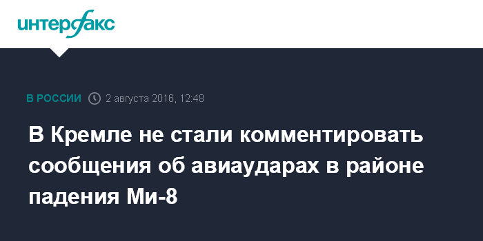 Москва. 2 августа. INTERFAX.RU - В Кремле не комментируют сообщения западных СМИ о нанесении бомбовых ударов в районе падения российского вертолета.