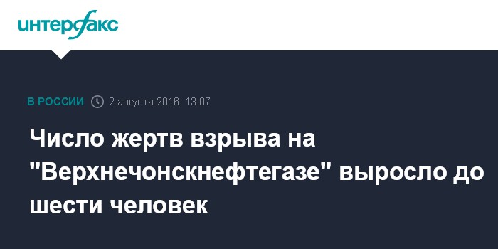 Москва. 2 августа. INTERFAX.RU - Число погибших при взрыве на "Верхнечонскнефтегазе" (ВЧНГ, входит в НК "Роснефть" выросло до шести человек, сообщила пресс-служба ВЧНГ.