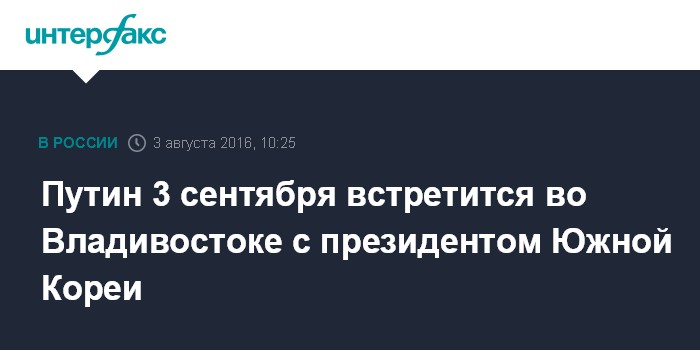 Москва. 3 августа. INTERFAX.RU - Встреча президентов Российской Федерации и Республики Корея Владимира Путина и Пак Кын Хе состоится 3 сентября во Владивостоке, сообщила пресс-служба Кремля.