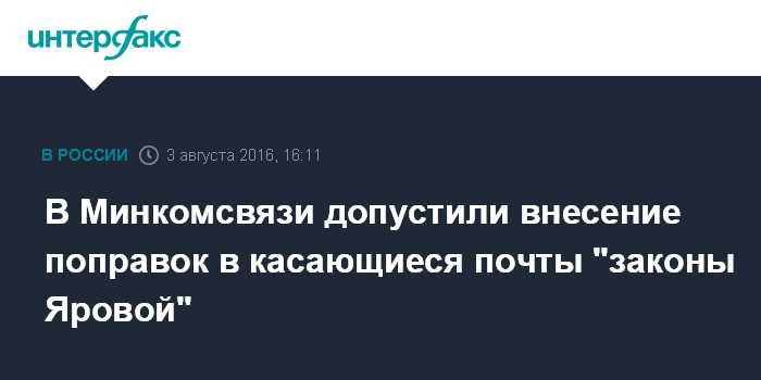 Москва. 3 августа. INTERFAX.RU - Минкомсвязи может внести поправки в "антитеррористический пакет" депутата Ирины Яровой и сенатора Виктора Озерова (так называемый "пакет Яровой"), детализирующие нормы о почтовых услугах, сообщил журналистам глава ведомства Николай Никифоров.