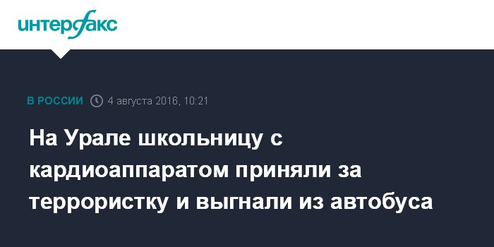Москва. 4 августа. INTERFAX.RU - Прокуратура в Свердловской области начала проверку после того, как школьницу с портативным аппаратом для снятия электрокардиограммы выгнали из маршрутного автобуса, сообщили в ведомстве "Интерфаксу".