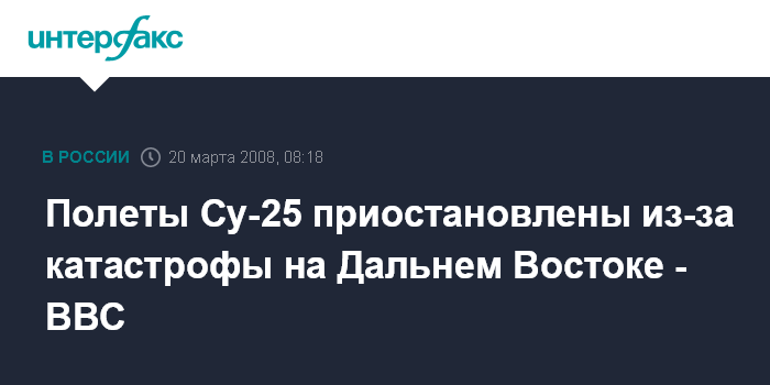 "20 марта в 3 часа 33 минуты (мск) при выполнении плановых полетов в авиагарнизоне Черниговка в 143 км от Владивостока произошла катастрофа самолета Су-25. На земле жертв и разрушений нет. Решением Главнокомандующего ВВС, полеты самолетов Су-25 временно приостановлены", - сообщил он.