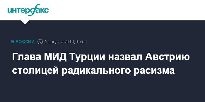 Москва. 5 августа. INTERFAX.RU - Глава МИД Турции Мевлют Чавушоглу назвал Австрию столицей радикального расизма, после того как канцлер Австрии Кристиан Керн предложил прекратить переговоры о вступлении Турции в Евросоюз, пишет The Guardian.