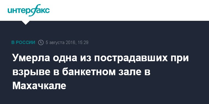 Москва. 5 августа. INTERFAX.RU - Одна из пострадавших в результате взрыва в банкетном зале "Лайли" в Махачкале (Дагестан) девушек скончалась, сообщила агентству "Интерфакс" руководитель пресс-службы Минздрава региона Зарина Агмадова.