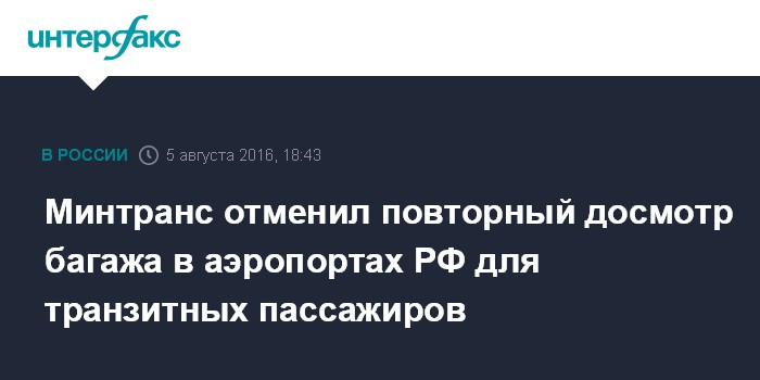 "Ключевым изменением является снятие требования о повторном досмотре багажа в аэропорту трансфера, расположенном на территории Российской Федерации, в случае, когда осуществляется перевозка по маршруту с промежуточной посадкой", - говорится в сообщении Минтранса.