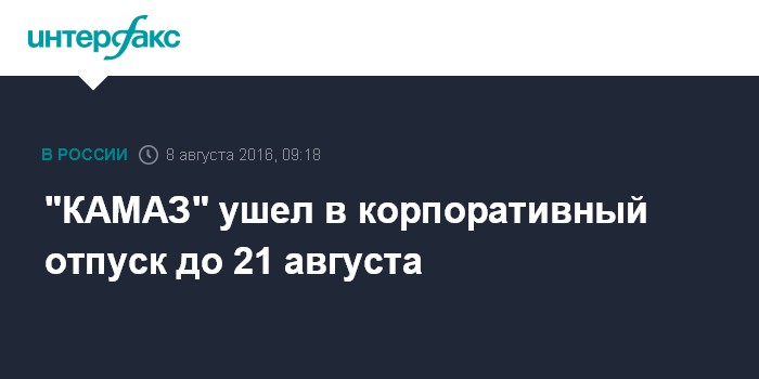 Москва. 8 августа. INTERFAX.RU - Сотрудники ПАО "КАМАЗ" с понедельника ушли в корпоративный отпуск, который продлится до 21 августа, сообщили "Интерфаксу" в компании.