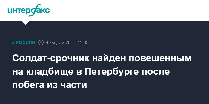 Москва. 9 августа. INTERFAX.RU - Солдат-срочник, сбежавший из воинской части в Горелово, найден повешенным на юге Петербурга, сообщил "Интерфаксу" источник в правоохранительных органах города во вторник.