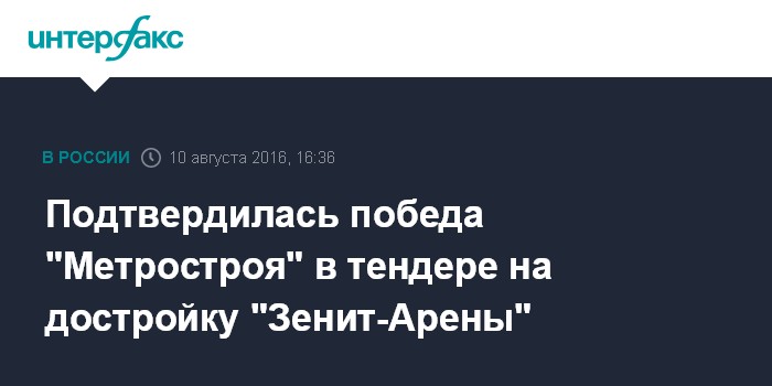 Москва. 10 августа. INTERFAX.RU - ОАО "Метрострой" стало победителем тендера на достройку футбольного стадиона "Зенит-Арена" на Крестовском острове в Санкт-Петербурге, возводимого к Чемпионату мира по футболу 2018 года. Об этом сообщается в материалах на сайте госзакупок.