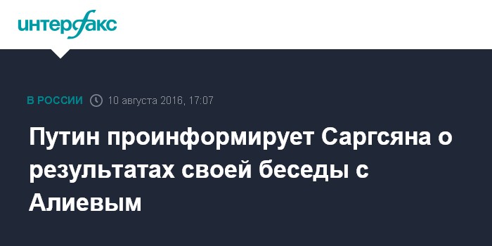 Москва. 10 августа. INTERFAX.RU - Президент РФ Владимир Путин на встрече со своим армянским коллегой Сержем Саргсяном заявил о намерении проинформировать его о результатах переговоров с азербайджанским лидером Ильхамом Алиевым в Баку.