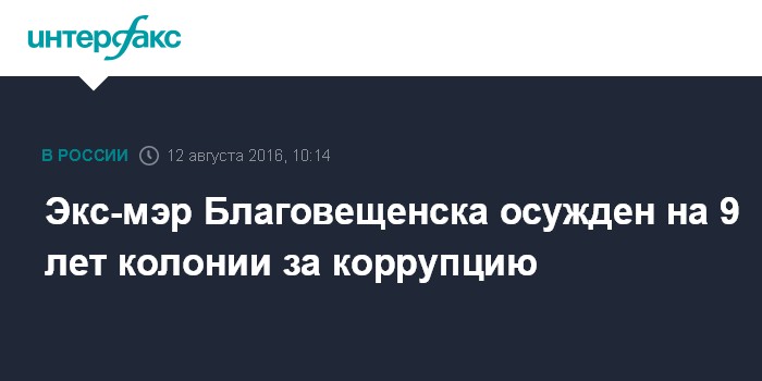 Москва. 12 августа. INTERFAX.RU - Благовещенский городской суд в пятницу приговорил бывшего главу города Александра Мигулю к девяти годам лишения свободы, передает корреспондент "Интерфакса".
