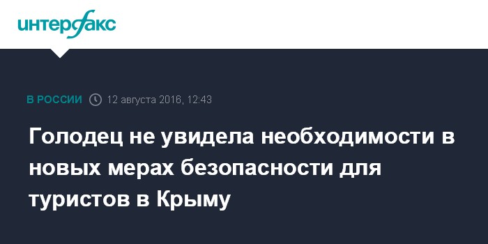 Москва. 12 августа. INTERFAX.RU - Ситуация в Крыму стабильная, и никаких дополнительных мер по безопасности туристов принимать не надо, заявила заместитель председателя правительства Ольга Голодец.