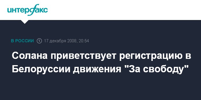Москва. 17 декабря. INTERFAX.RU - Верховный представитель по общей внешней политике и безопасности ЕС Хавьер Солана приветствовал принятое в среду министерством юстиции Белоруссии решение зарегистрировать движение "За свободу", которое возглавляет бывший кандидат в президенты республики Александр Милинкевич.