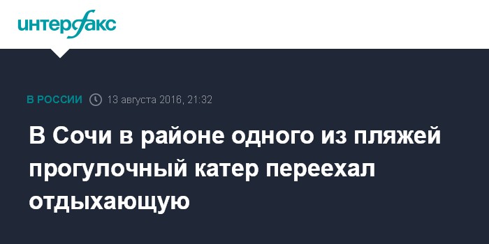Москва. 13 августа. INTERFAX.RU - Женщина, купавшаяся в районе Адлера, погибла от травм, нанесенных ей прогулочным катером, сообщили агентству "Интерфакс" в экстренных службах Сочи.