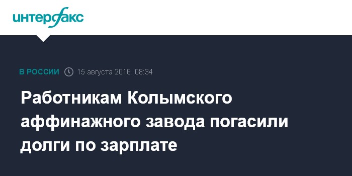 Москва. 15 августа. INTERFAX.RU - Задолженность по зарплате перед работниками ОАО "Колымский аффинажный завод" (КАЗ), обанкротившегося в 2015 году из-за неплатежеспособности, полностью погашена.