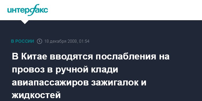 Пекин. 18 декабря. ИНТЕРФАКС-КИТАЙ - Китай с 20 декабря отменяет запреты на провоз авиапассажирами внутренних авиарейсов в ручной клади зажигалок и жидкостей, сообщает Управление гражданской авиации Китая.