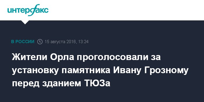Москва. 15 августа. INTERFAX.RU - Большинство жителей Орла в ходе соцопроса высказались за установку памятника Ивану Грозному перед театром юного зрителя "Свободное пространство", сообщили "Интерфаксу" в пресс-службе облправительства в понедельник.