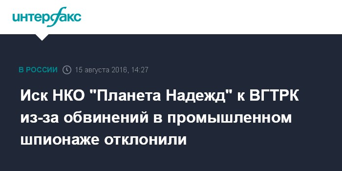 Иск НКО "Планета Надежд" к ВГТРК из-за обвинений в промышленном шпионаже отклонили