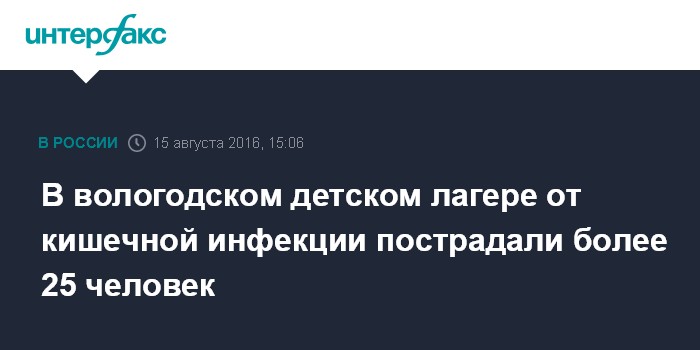 Москва. 15 августа. INTERFAX.RU - Количество детей, пострадавших от кишечной инфекции в вологодском лагере "Жемчужина Мологи", достигло 26 человек, сообщает региональное управление Роспотребнадзора.