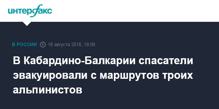 Москва. 16 августа. INTERFAX.RU - Три группы альпинистов во вторник обратились за помощью к спасателям в Кабардино-Балкарии, сообщил агентству "Интерфакс" руководитель пресс-службы ГУ МЧС России по КБР Кантемир Беров.