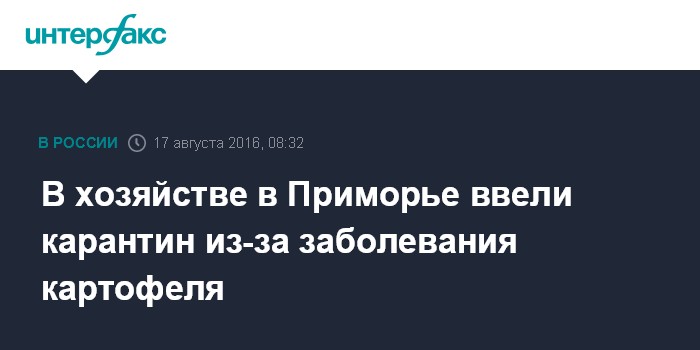 Москва. 17 августа. INTERFAX.RU - Россельхознадзор в Приморском крае принял меры для ликвидации очага опасного для картофеля заболевания, ранее никогда не регистрировавшегося в регионе.