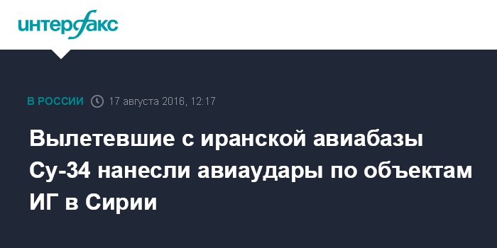Накануне Минобороны РФ сообщило, что "16 августа дальние бомбардировщики Ту-22М3 и фронтовые бомбардировщики Су-34, взлетев с полной бомбовой нагрузкой с аэродрома базирования Хамадан (Исламская Республика Иран), нанесли групповой авиационный удар по объектам террористических группировок "Исламское государство" и "Джабхат ан-Нусра" в провинциях Алеппо, Дейр-эз-Зор и Идлиб", - заявили в Минобороны РФ.