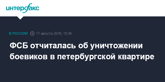 Москва. 17 августа. INTERFAX.RU - Сотрудники ФСБ в Петербурге в ходе спецоперации ликвидировали боевиков, объявленных в федеральный розыск по обвинению в участии в вооруженных формированиях на Северном Кавказе.
