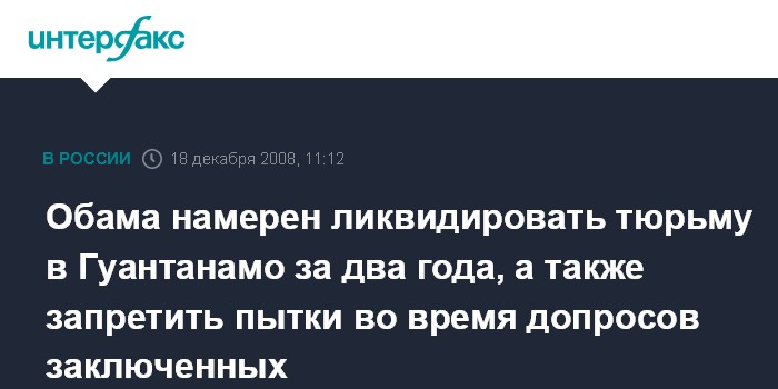 Москва. 18 декабря. INTERFAX.RU - Избранный президент США Барак Обама планирует в течение двух лет закрыть тюрьму в Гуантанамо и положить конец применению в американской армии пыток в отношении предполагаемых террористов, сообщает в четверг британская телерадиокорпорация Би-Би-Си.