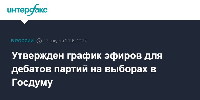 Москва. 17 августа. INTERFAX.RU - ЦИК утвердила график распределения эфирного времени для дебатов и агитационных материалов, которое безвозмездно распределяют общероссийские государственные телерадиоорганизации 14 политическим партиям. Это решение принято в среду на заседании Центризбиркома.