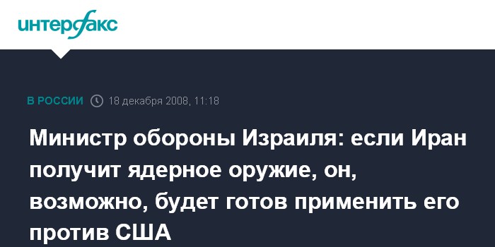 Москва. 18 декабря. INTERFAX.RU - Министр обороны Израиля Эхуд Барак полагает, что Иран в случае, если разработает ядерное оружие, возможно, будет готов применить его против США, пишет британская газета "Дейли телеграф".