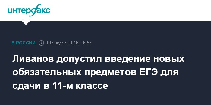 Москва. 18 августа. INTERFAX.RU - Введение новых обязательных предметов ЕГЭ для сдачи в 11-м классе возможно после 2018 года, заявил министр образования и науки России Дмитрий Ливанов.