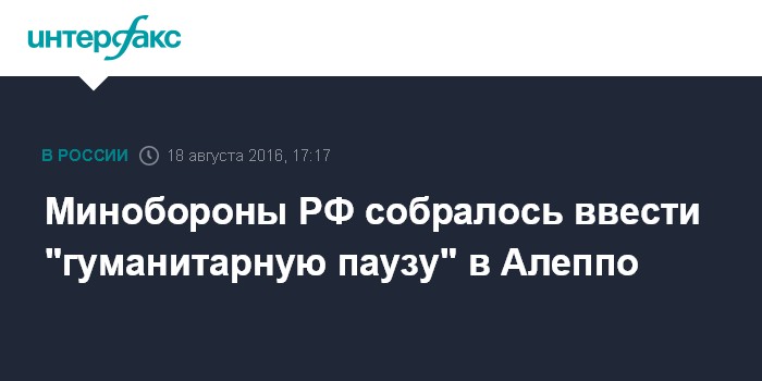 Москва. 18 августа. INTERFAX.RU - В Минобороны РФ заявили о готовности уже на следующей неделе ввести первую 48-часовую "гуманитарную паузу" в Алеппо.