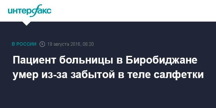 Москва. 19 августа. INTERFAX.RU - Житель Биробиджана в Еврейской АО скончался из-за забывчивости врачей, которые, делая операцию, оставили в его теле марлевую салфетку.