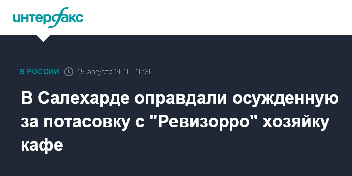 Москва. 19 августа. INTERFAX.RU - Коллегия суда Ямало-Ненецкого автономного округа отменила приговор владелице кафе "Виктория" в Салехарде, которую горсуд в июне признал виновной по делу о потасовке со съемочной группой "Ревизорро". Об этом сообщили агентству "Интерфакс" в окружном суде.