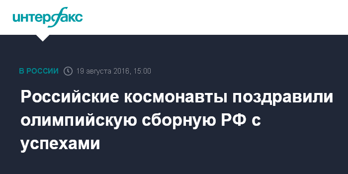 Москва. 19 августа. INTERFAX.RU - Российские космонавты поздравили сборную России с успешным выступлением на Олимпиаде, сообщили "Интерфаксу" в Центре подготовки космонавтов (ЦПК).